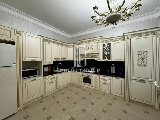 На первом этаже находится гардеробная, просторная спальня, детская, большая прихожая и кухня, оборудованная современной техникой и уютной обеденной зоной.